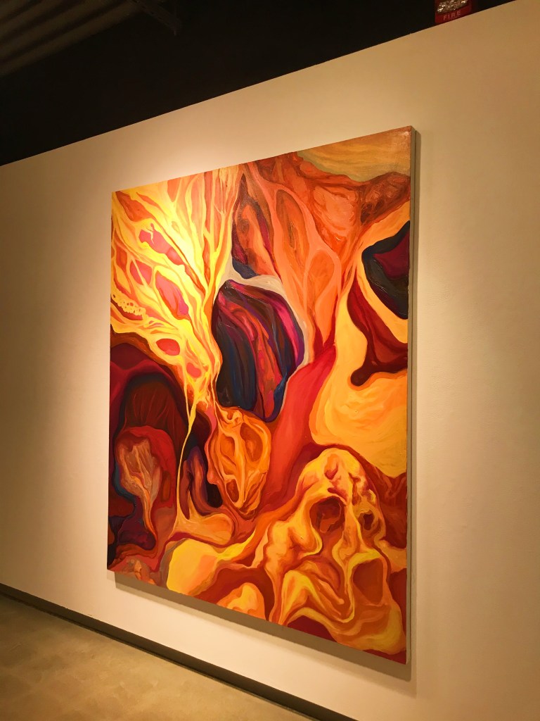 After having the pleasure of talking to Madeline (she was so nice!), I learned a lot about the thought that went into this piece. The first conversation point was figuring out her desire to use such a large canvas. Madeline explained that she was normally using a smaller canvas, along with much smaller brushes. She was encouraged by her professor to use a greater sized canvas. She also described what the painting process was like, and that she had to constantly take several steps away from the painting to make sure it was scaled. Lastly, when about the ideas for the content of the painting, she explained that she often hikes and takes photos of things she might later paint. The painting Delve Deep is her depiction of a cave, and the bright colors symbolize the feeling she felt when she looked at each part of the cave.