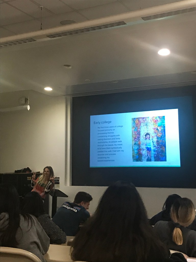 All of her work is extraordinary. She is extremely talented. Not only did I enjoy the color of her art, but I also respect her ability to express her relationship with her eating disorder and make meaningful art. I love her ultraviolet paintings, but my favorite piece was the sushi rolling off of the man’s head. I enjoy that it was a pun for “sushi rolls,” but I found the piece even more fascinating when I discovered that this was the first painting that made her realize she had been subconsciously painting about her eating disorder. I would love to have her artwork hung up in my house someday.